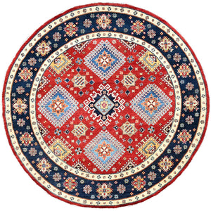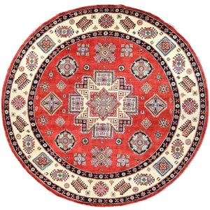 8'x8' Crimson Red, Special Kazak With Geometric Medallions, Natural Dyes, Pure Wool, Hand Knotted, Round Oriental Rug FWR512520