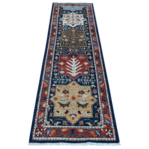 2'7"x7'9" Broncos Navy Blue, Runner, Armenian Inspired Caucasian Design, Pure And Soft Wool, Hand Knotted, Natural Dyes, Denser Weave, Small Bird Figurines, 200 Kpsi, Oriental Rug FWR924