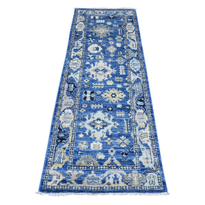 2'8"x7'8" Sapphire Blue, Vegetable Dyes With Rural Elements All Over Design, Soft Pile, Afghan Angora Oushak, Hand Knotted, Wool Weft, Runner Oriental Rug FWR534846