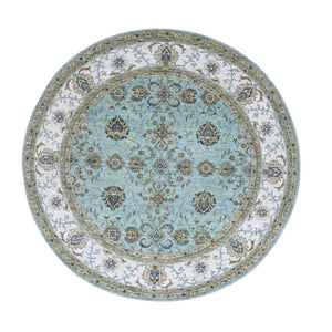 8'x8' Crystal Blue, Agra, Shah Abbas Flower Vines Design, Hand Knotted, Pure Wool, Natural Dyes, Denser Weave, Round, Oriental Rug FWR456840