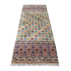 3'x7'7" Gray With Colorful Tassles Super Kazak Khorjin Design Hand Knotted Organic Wool Oriental Runner Rug FWR340848