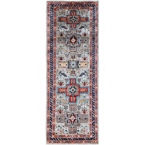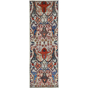 2'8"x7'5" Mirage Gray, Armenian Inspired Caucasian Design With Bird Figurines, Hand Knotted, Super Fine Wool, 200 Kpsi, Denser Weave, Vegetable Dyes, Runner, Oriental Rug FWR8052