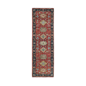 2'8"x8'1" Ochre Red, Denser Weave, Antiqued Fine Heriz Re-creation, Hand Knotted, Hand Spun New Zealand Wool, Soft Pile, Vegetable Dyes, Runner, Oriental Rug FWR549024