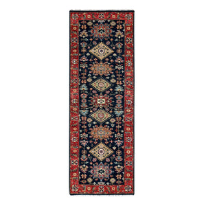 2'9"x8' Denim Blue, Karajeh Design With Tribal Medallions, Hand Knotted, 100% Wool, Runner, Oriental Rug FWR61812