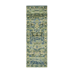 2'7"x8'4" Artichoke Green, Broken And Erased Persian Inspired With Birds Design, Distinct Abrash, Shaved Low, Hand Knotted, Pure Wool, Runner, Oriental Rug FWR454314