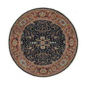 7'10"x7'10" Midnight Blue, Antiqued Fine Heriz Re-creation With All Over Vines Design, Hand Knotted, Hand Spun New Zealand Wool, Vegetable Dyes, Round, Oriental Rug FWR549132