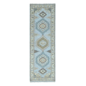 2'7"x7'10" Cloud Gray, Persian Village Inspired Geometric Elements Design, Hand Knotted, Pure Wool, Natural Dyes, Denser Weave, Runner, Oriental Rug FWR61926