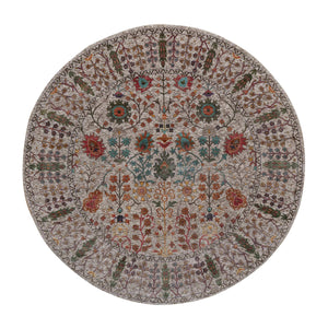 7'10"x7'10" Snow White With Brown, Directional Vase Design, Hand Knotted, Silk With Textured Wool, Round, Oriental Rug FWR551514