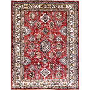 8'1"x10'6" Rich Red, Dense Weave, Vegetable Dyes, 100% Wool, Afghan Super Kazak With Geometric Elements, Hand Knotted, Oriental Rug FWR514710