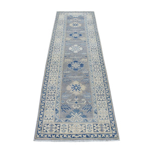 • 2'6"x9'4" Gray Vintage Look Kazak Pure Wool Tribal Design Hand Knotted Runner Oriental Rug FWR327672