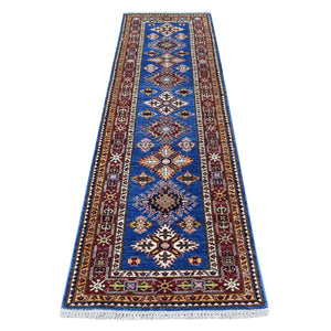 • 2'4"x9'2" Khorjin Design Runner Blue Super Kazak Tribal Pure Wool Hand Knotted Oriental Rug FWR317106