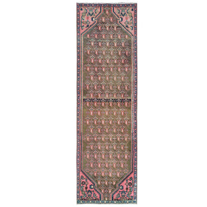 3'4"x9'3" Walnut Brown, Hand Knotted Vintage Persian Hamadan With Bird Figurines, Abrash Cropped Thin Distressed Look Worn Wool, Wide Runner Oriental Rug FWR371232