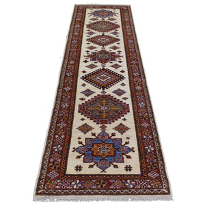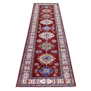 2'7"x8'10" Soft Natural Wool Hand Knotted Brick Red Super Kazak With Tribal Medallions Oriental Runner Rug FWR408174