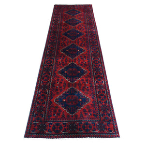 2'10"x9'4" Deep And Saturated Red With Geometric Design Hand Knotted Afghan Khamyab, Velvety Wool Runner Oriental Rug FWR431418