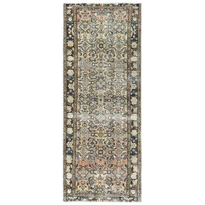 3'5"x9'2" Beige, Hand Knotted, Vintage Persian Hamadan With Fish Mahi Herat All Over Design, Clean, Distinct Abrash, Worn Down, Pure Wool Wide Runner Oriental Rug FWR491298