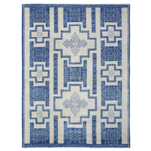 8'10"x11'8" Ivory With Denim Blue, Hand Knotted Fine Peshawar With Intricate, Geometric, Motifs, Densely Woven Soft Organic Wool, Oriental Rug FWR436320
