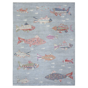 9'2"x11'9" Light Gray, Densely Woven Soft Wool Hand Knotted, Afghan Peshawar With Colorful Oceanic Fish Design Natural Dyes, Oriental Rug FWR436584
