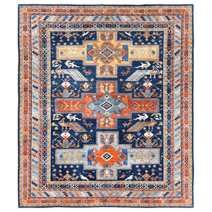 9'1"x11'7" Navy Blue, Armenian Inspired Caucasian Design With Birds Figurines 200 Kpsi, Vegetable Dyes Dense Weave, Pure Wool Hand Knotted, Oriental Rug FWR492186