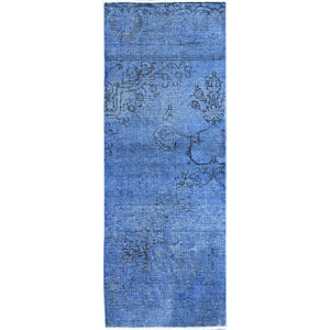 2'4"x11'2" Sapphire Blue, Overdyed Vintage Persian Tabriz, Cropped Thin, Worn And Distressed, Sides And Ends Professionally Secured, Hand Knotted, Pure Wool, Fragment, Narrow Runner, Oriental Rug FWR5664
