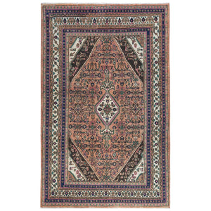 4'7"x12'9" Peach With Chocolate Brown, Vintage Persian Karajeh, Bohemian, Clean, Fragment, Hand Knotted Pure Wool, Distressed Wide Runner Oriental Rug FWR491166