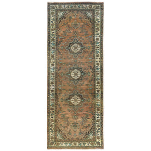 3'3"x12'10" Hazelnut Brown Vintage Northwest Persian With Serrated Medallions, Distressed, Hand Knotted Pure Wool, Professionally Cleaned, Wide Runner Oriental Rug FWR491208