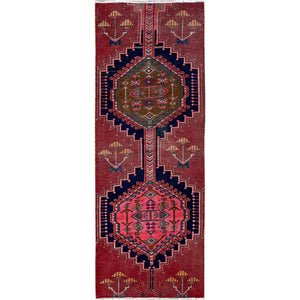 3'5"x9'6" Prismatic Red, Vintage Persian Shiraz With Small Animal Figurines And Geometric Design, Good Condition, Hand Knotted, Clean, Even Wear, Pure Wool, Wide Runner, Oriental Rug FWR125226