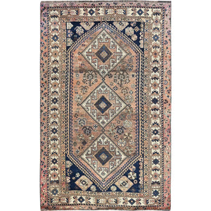 4'2"x6'7" Vintage Persian Shiraz With Rare Ivory Color Background, Geometric Pattern, Hand Knotted, Pure Wool, Shaved Down, Zero Pile, Sides And Ends Professionally Secured, Clean, Oriental Rug FWR5094
