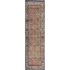 3'3"x10'7" Peach Color, Vintage Northwest Persian With All Over Intricate Geometric Design, 100% Wool, Hand Knotted, Worn And Distressed, Sheared Low, Zero Pile, Sides And Ends Professionally Secured, Good Condition, Wide Runner, Oriental Rug FWR5250