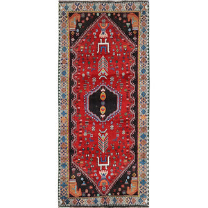 3'5"x8'2" Crimson Red, Vintage Persian Shiraz With Geometric Pattern, Small Animal Figurines, Shaved Low, Zero Pile, Sides And Ends Professionally Secured, Clean, Hand Knotted, Pure Wool, Wide Runner, Oriental Rug FWR5298