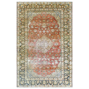 6'10"x10'6" Apricot Color, Worn Wool, Hand Knotted, Vintage Persian Kashan, Distressed Look, Cropped Thin, Oriental Rug FWR369780