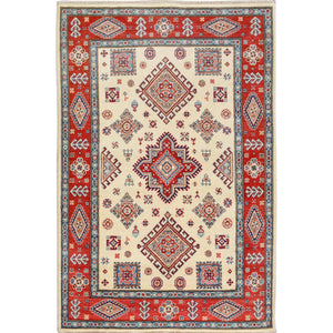 4'x5'10" Ivory Special Kazak Tribal Design Pure Wool Hand Knotted Oriental Rug FWR342402