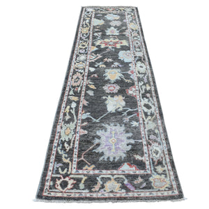 2'9"x9'8" Charcoal Black With Pop Of Color Angora Oushak Soft & Vibrant Wool Hand Knotted Oriental Runner Rug FWR336486