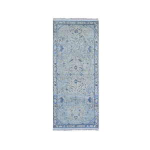 2'6"x6' Blue Distressed Oushak Pure Silk With Textured Wool Wide Runner Hand Knotted Oriental Rug FWR358458