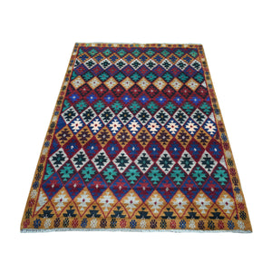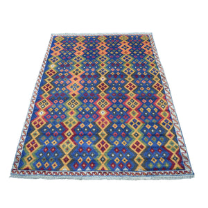 4'1"x5'8" Blue Colorful Afghan Baluch Geometric Design Hand Knotted Pure Wool Oriental Rug FWR319896