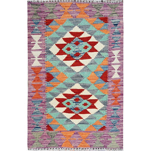 2'x3' Teal Blue, Afghan Kilim With Colorful Geometric Pattern, Vegetable Dyes, Pure Wool, Hand Woven, Flat Weave, Reversible, Mat, Oriental Rug FWR7044