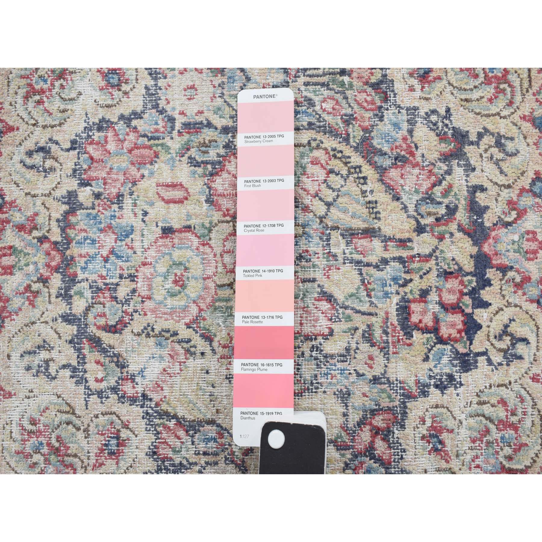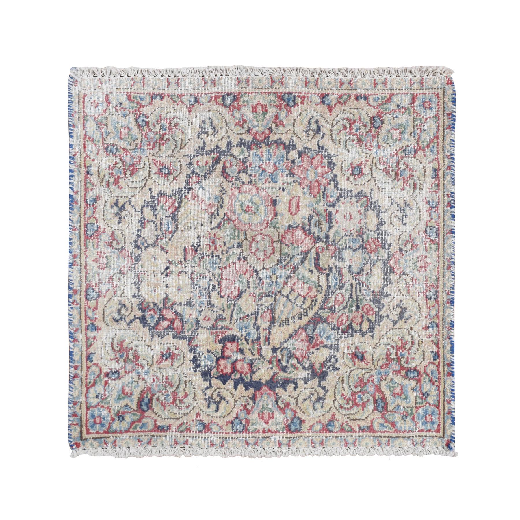 1'7"x1'7" Indigo Blue, Hand Knotted, Vintage And Worn Persian Kerman With Leaf And Bird Design, Cropped Thin, Distressed, Pure Wool, Square, Oriental Rug FWR468738