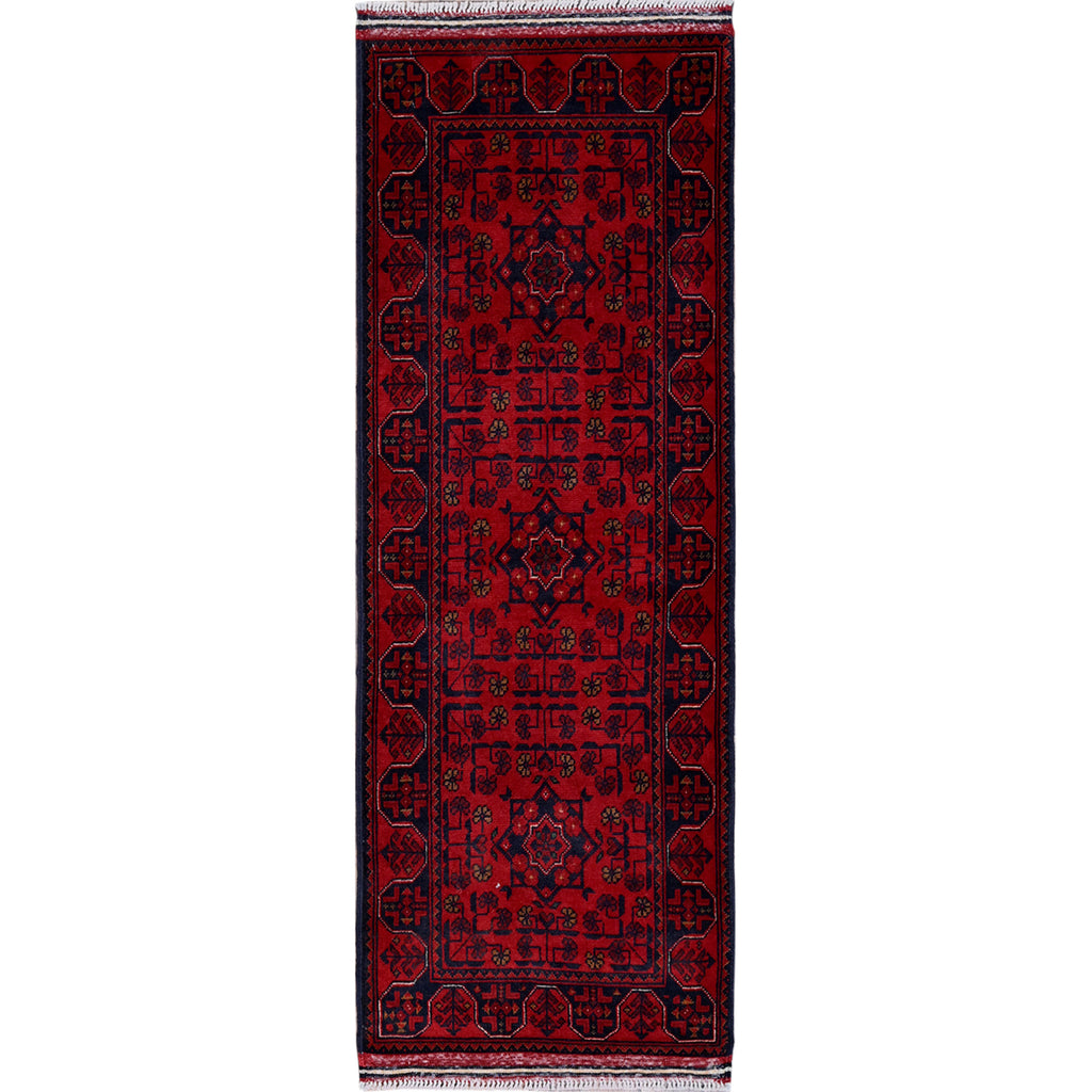 1'9"x4'9" Crimson Red, Soft Wool, Afghan Khamyab With Geometric Pattern, Hand Knotted, Vegetable Dyes, Short & Narrow Runner, Oriental Rug FWR4440