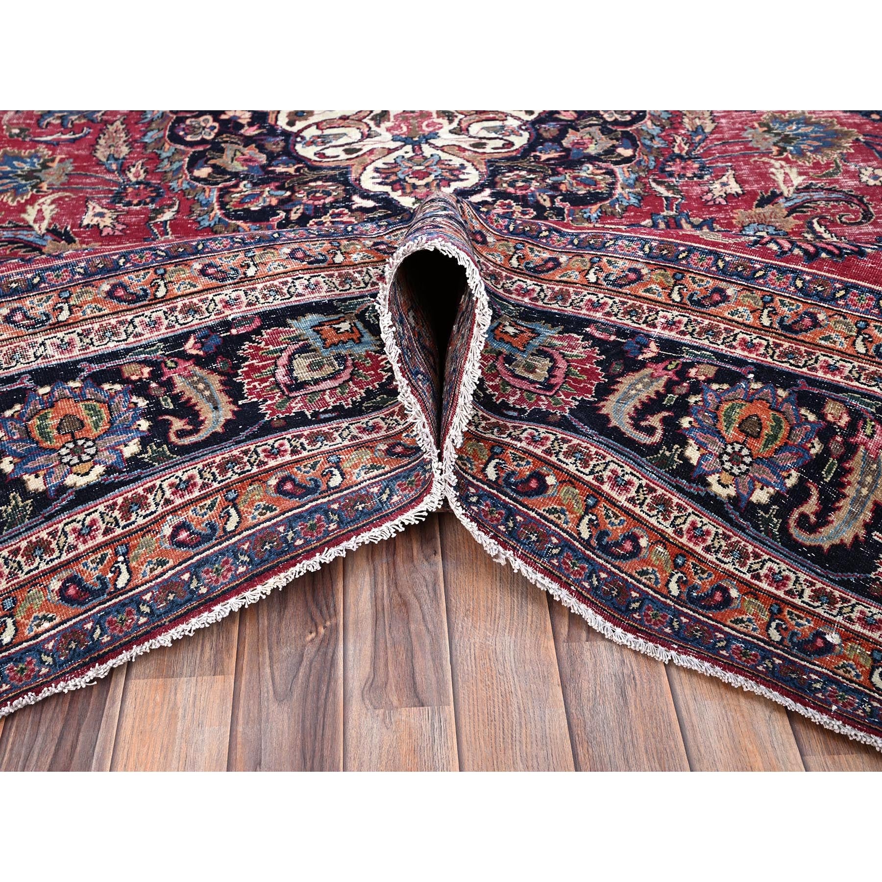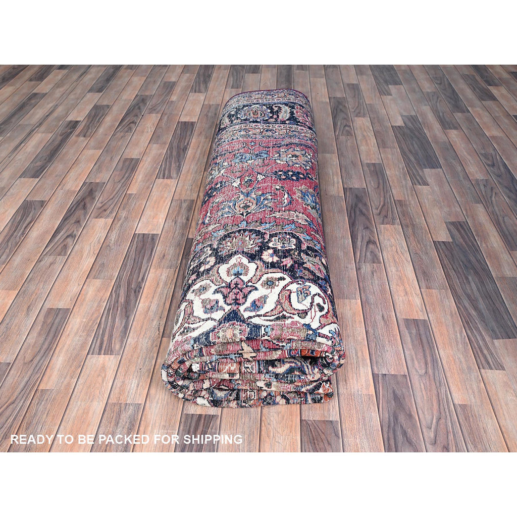 10'x12'7" Barbados Cherry Red, Vintage Persian Mashad, Hand Knotted 100% Wool, Sheared Low And Cropped Thin, Distressed Look, Good Condition, Cleaned, Sides And Ends Professionally Secured, Worn Oriental Rug FWR517170
