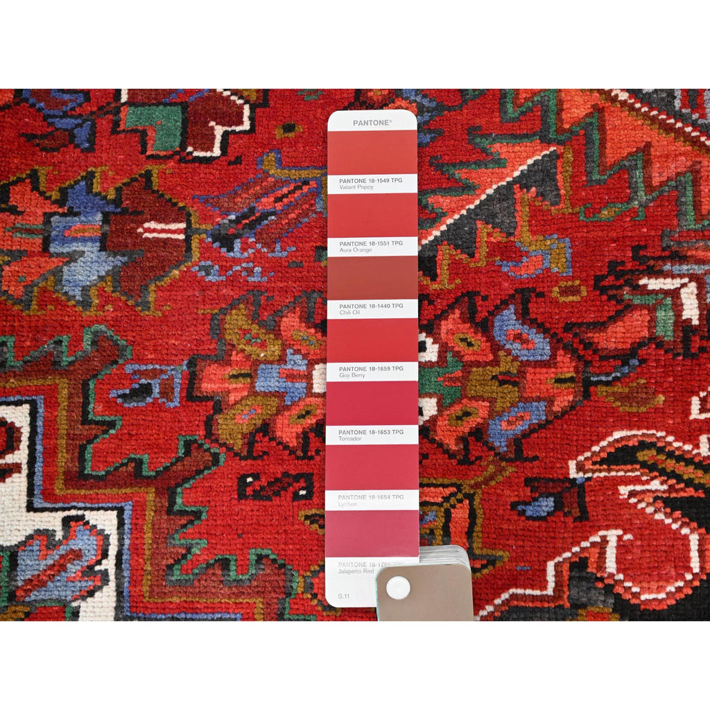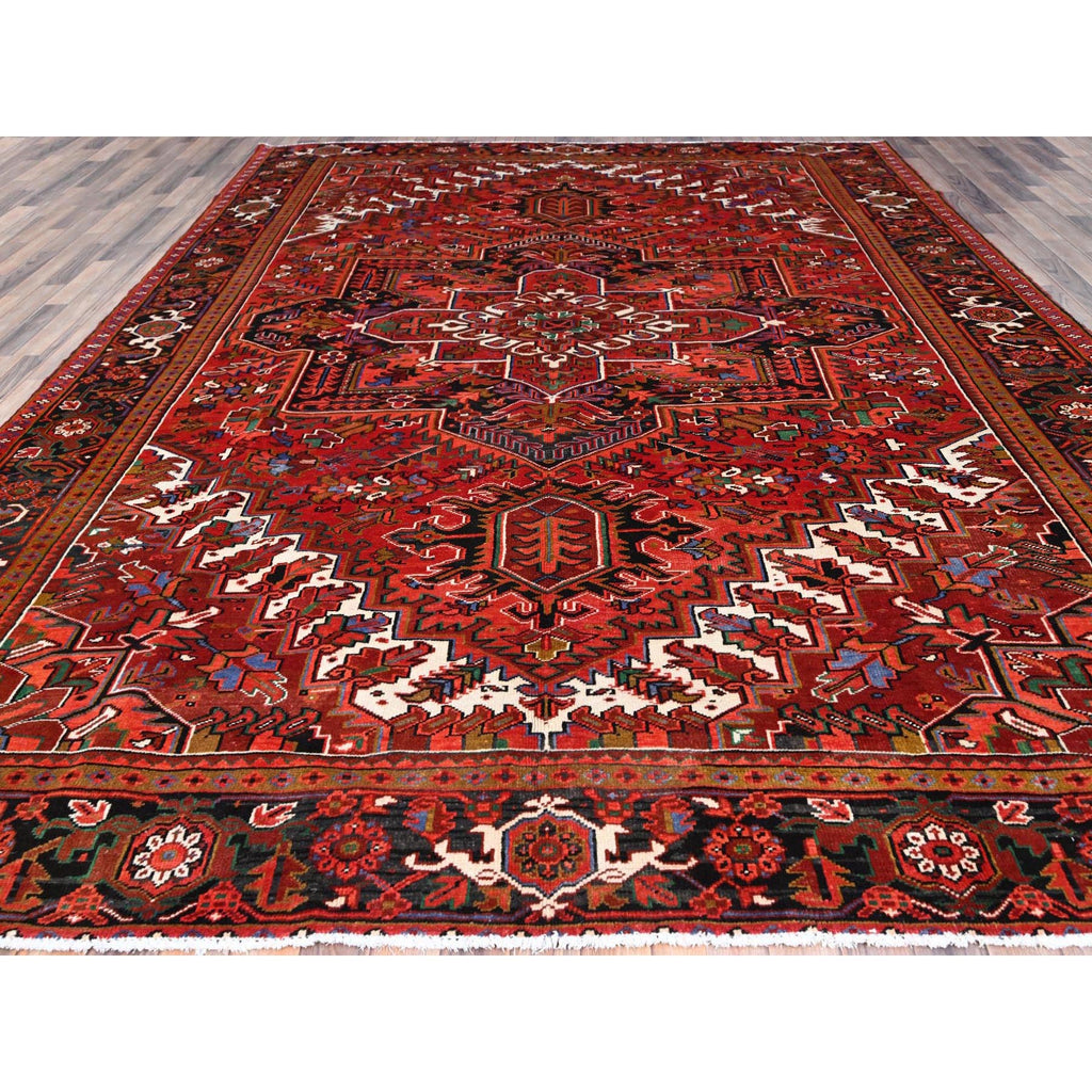 10'x12'9" Crimson Red With Asphalt Black Border, Large Colorful Centre Geometric Pattern, Secured And Cleaned, Hand Knotted, Great Condition, Pure And Soft Wool, Sheared Low, Semi Antique Persian Heriz Oriental Rug FWR702