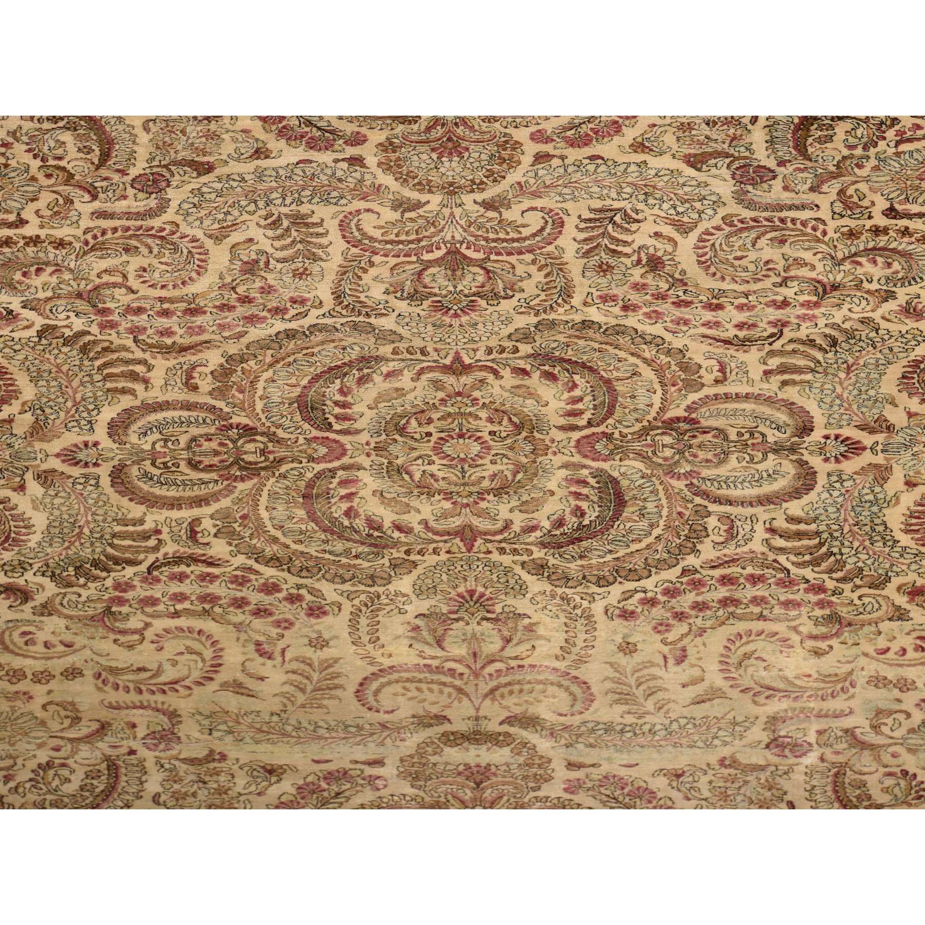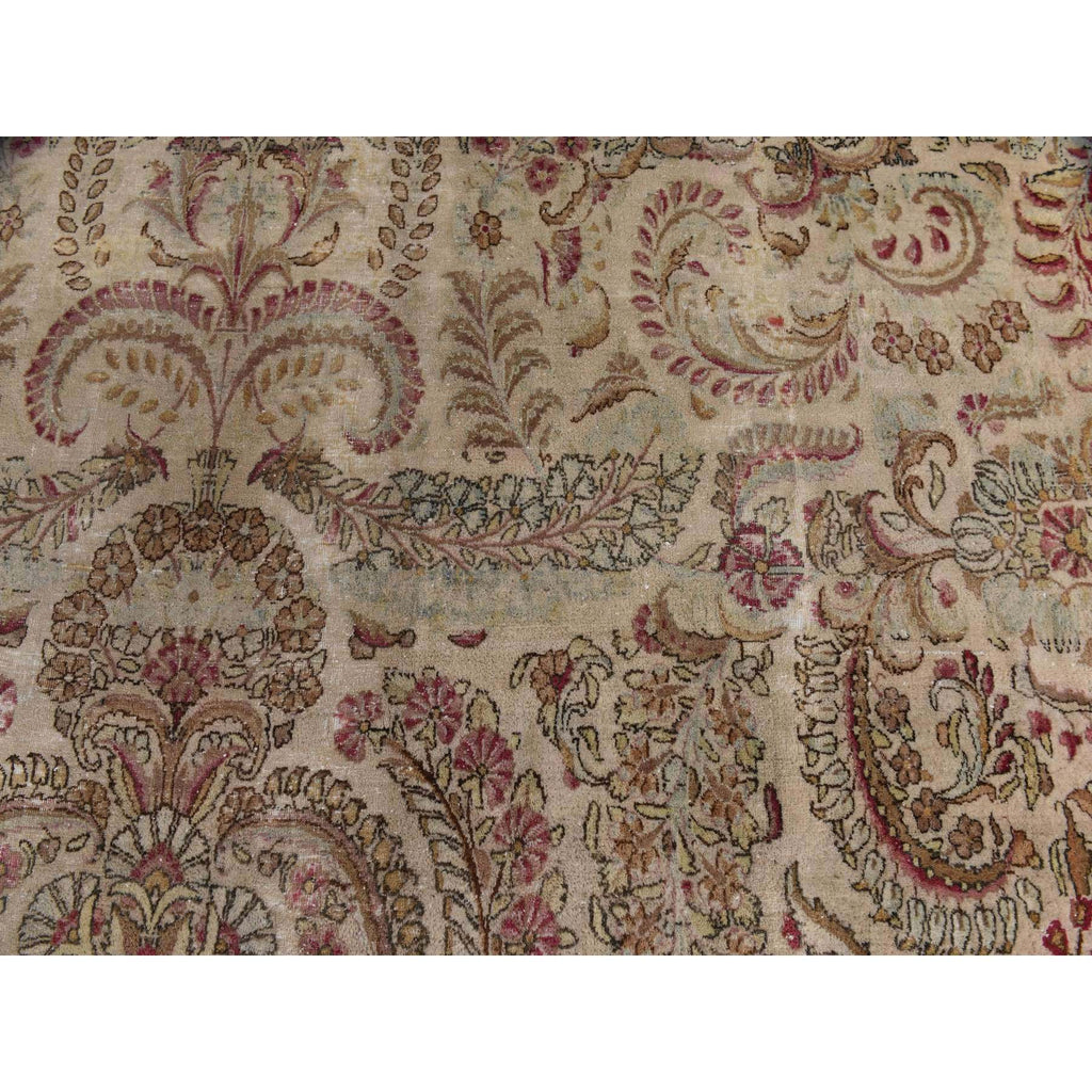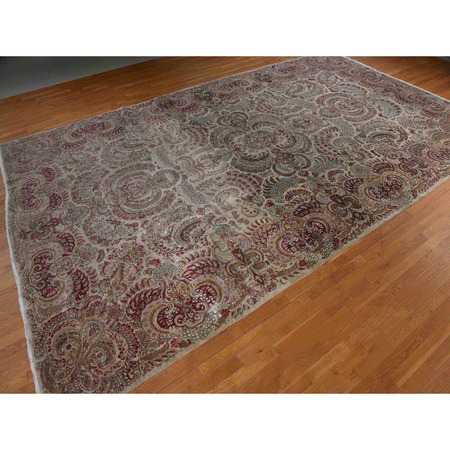 11'7"x19'3" Bone White, Antique Persian Kerman, Clean, Some Wear, Sides And Ends Secured, 100% Wool, Hand Knotted, Oversized, Oriental Rug FWR469974
