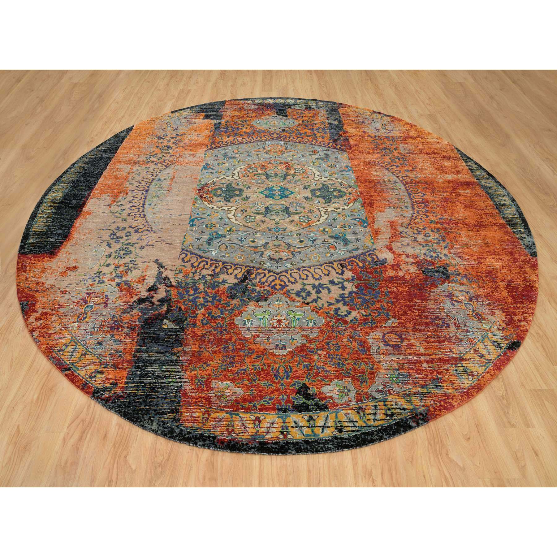 12'1"x12'1" Metallic Orange, Ancient Ottoman Erased Design, Ghazni Wool, Hand Knotted, Round Oriental Rug FWR395400