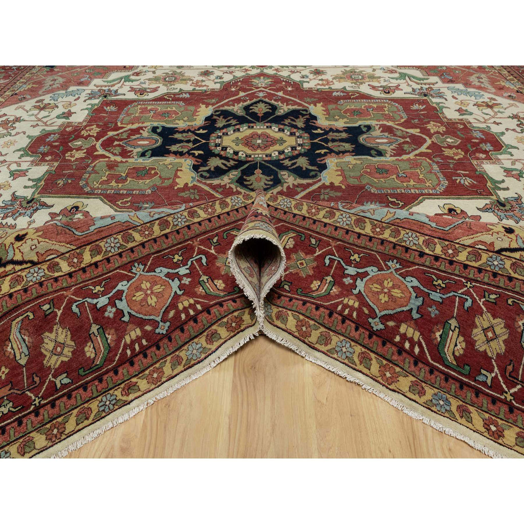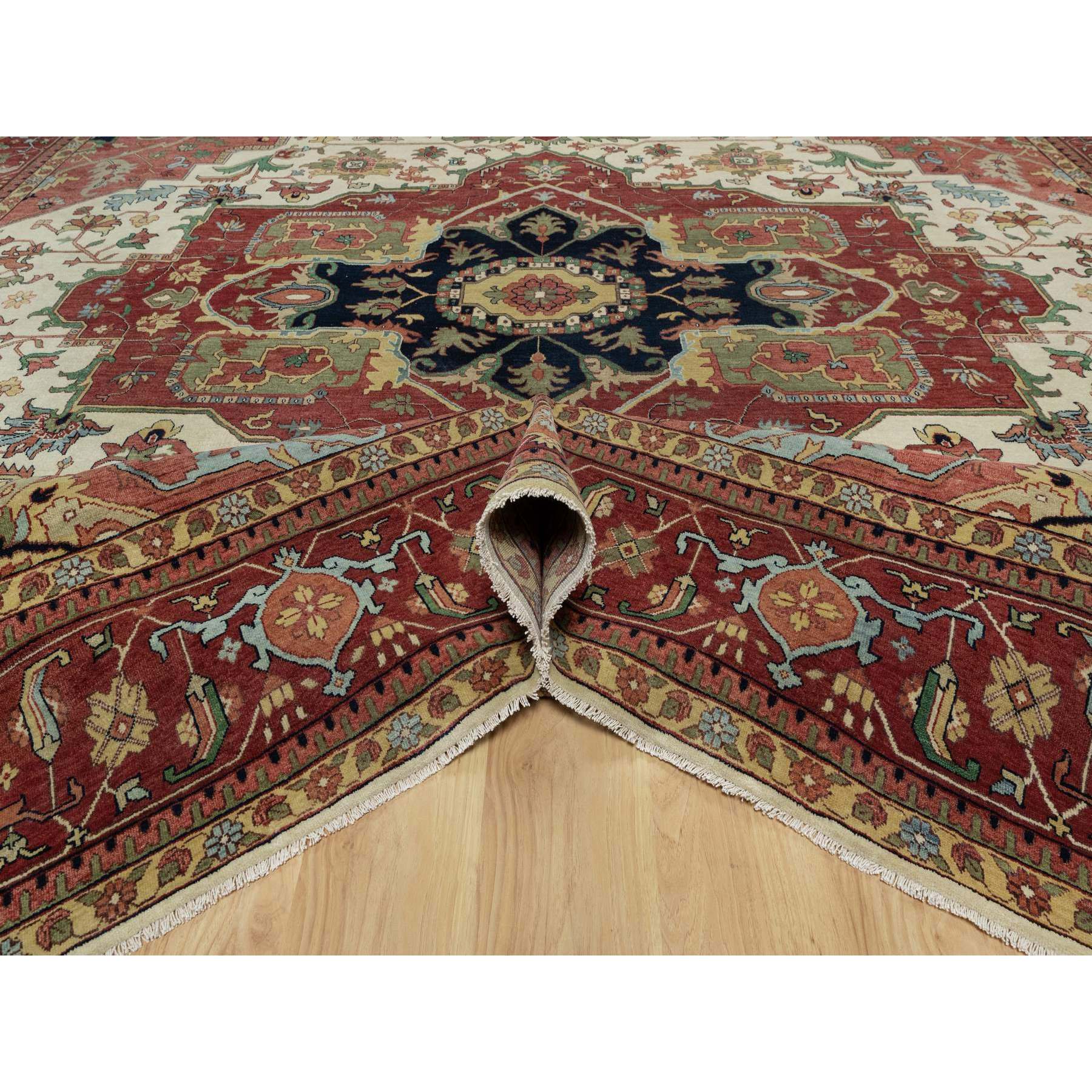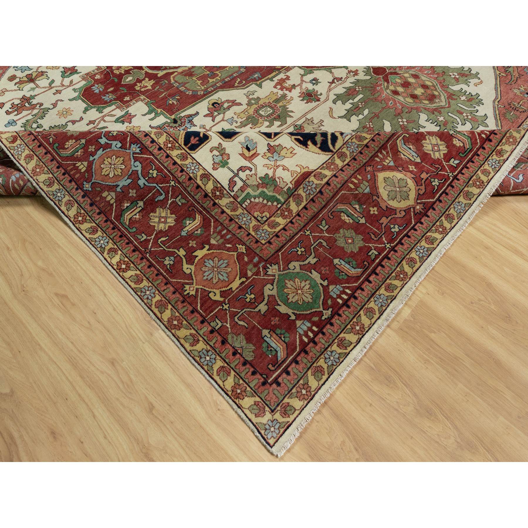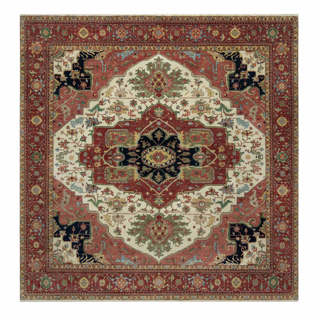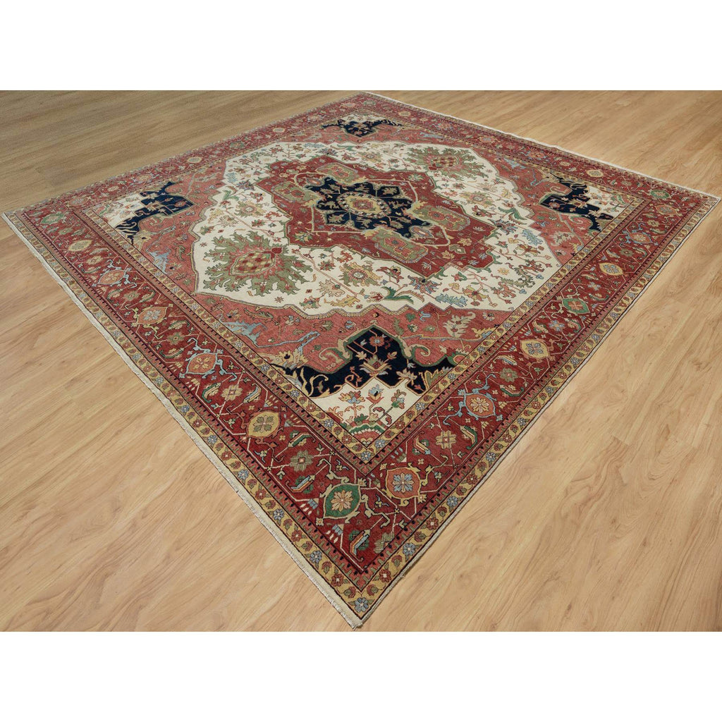12'3"x12'3" Pearl White With Red, Antiqued Fine Heriz Re-creation With Medallion Design, Denser Weave, Hand Spun New Zealand Wool, Hand Knotted, Square, Oriental Rug FWR546642