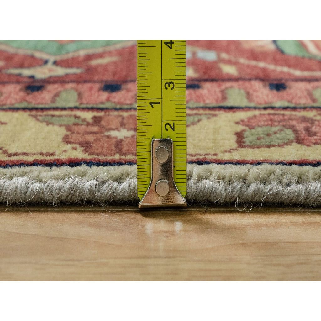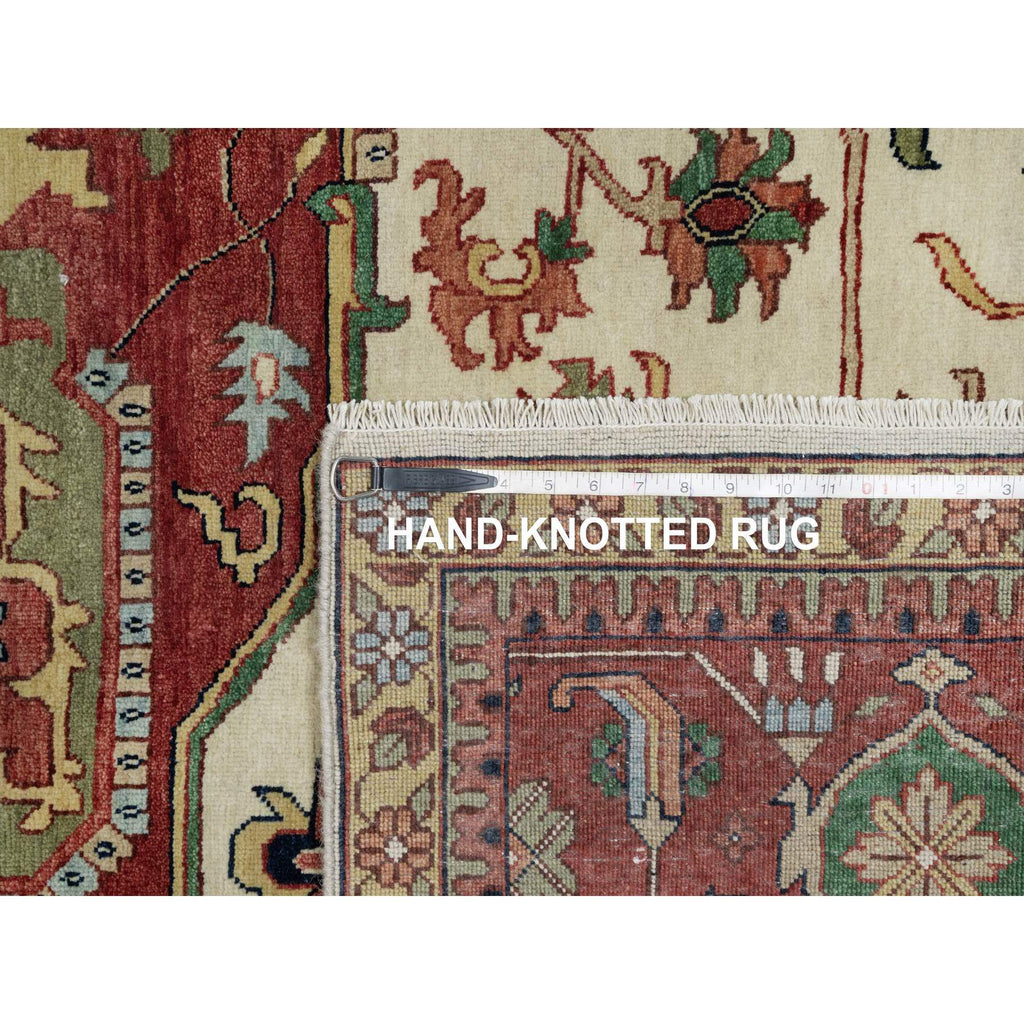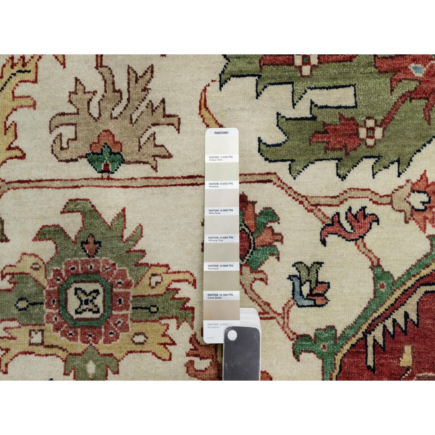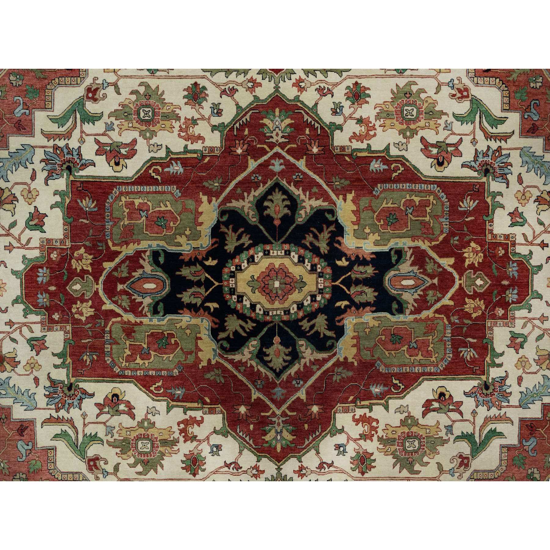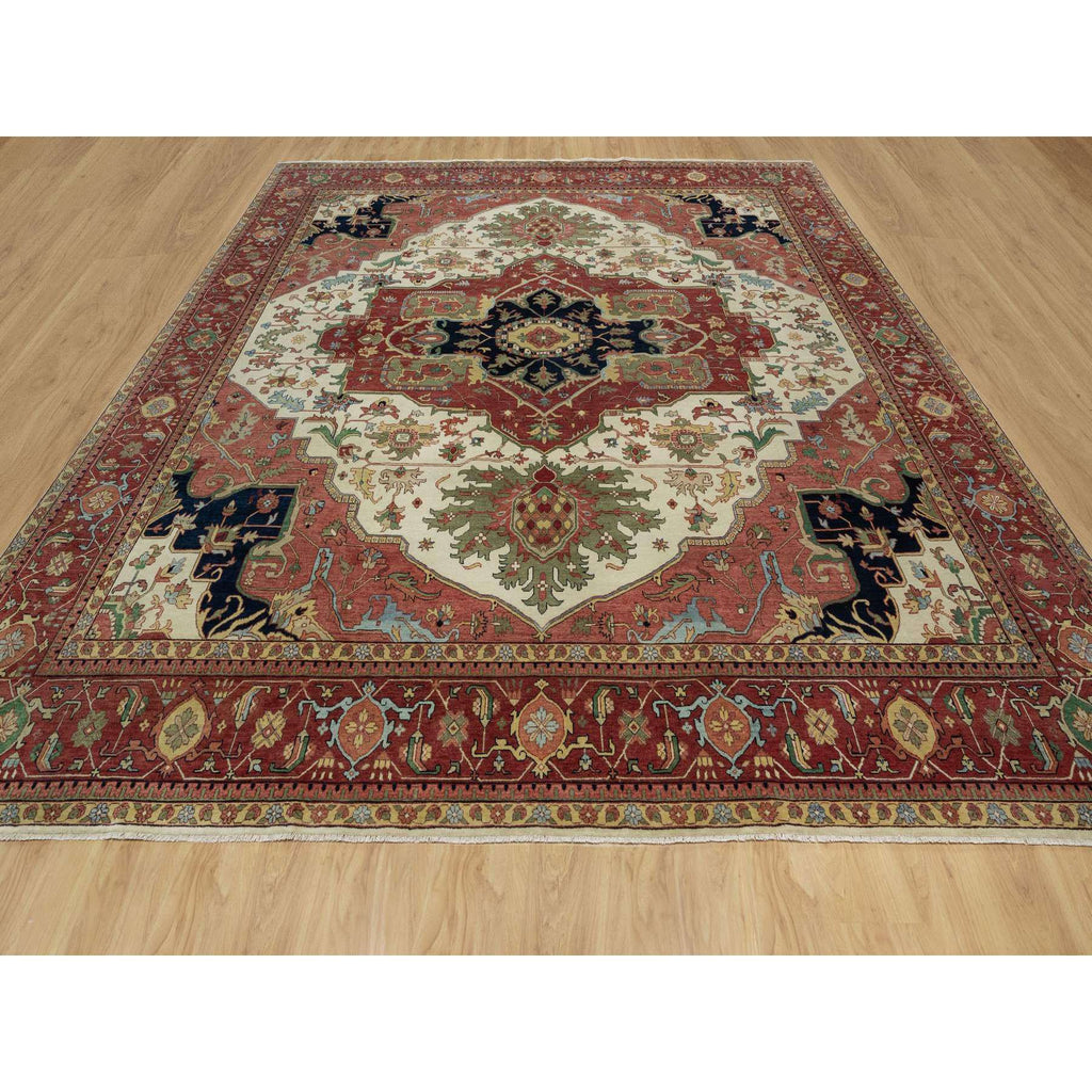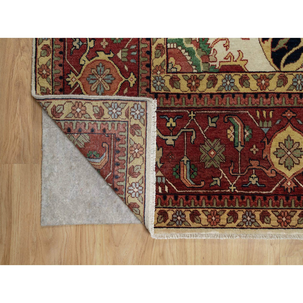 12'3"x12'3" Pearl White With Red, Antiqued Fine Heriz Re-creation With Medallion Design, Denser Weave, Hand Spun New Zealand Wool, Hand Knotted, Square, Oriental Rug FWR546642