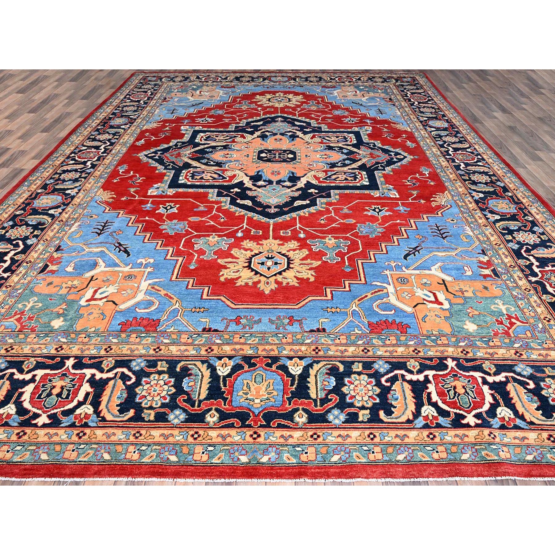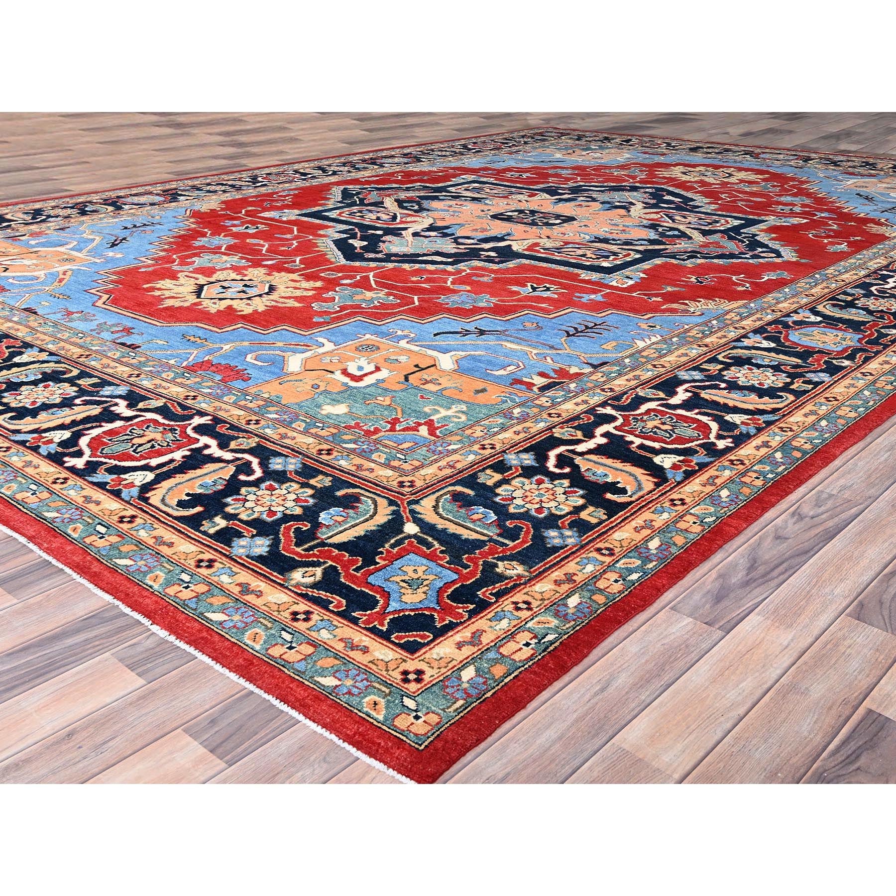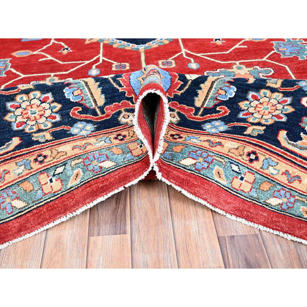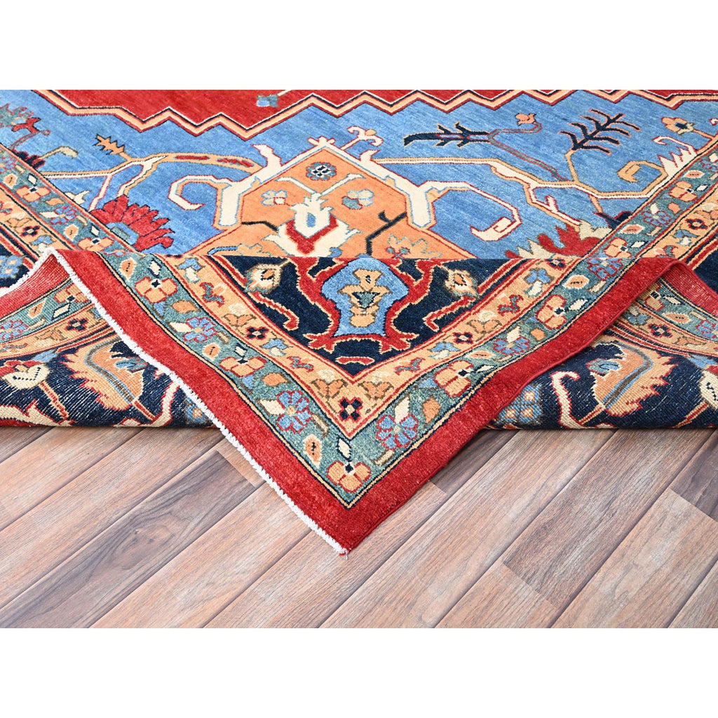 12'x17'2" Venetian Red, Delft Blue Border, Afghan Peshawar Serapi And Heriz Tribal Design, Hand Knotted, Soft Wool, Vegetable Dyes, Densely Woven Oriental Oversized Rug FWR521754