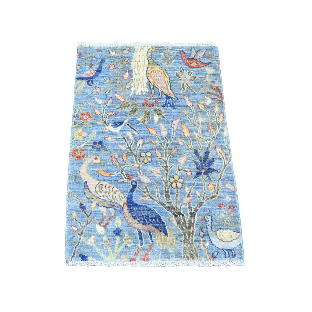 2'1"x3'1" Maya Blue, Soft Wool, Afghan Peshawar With Birds Of Paradise Design, Vegetable Dyes, Hand Knotted, Mat, Sample, Oriental Rug FWR120228