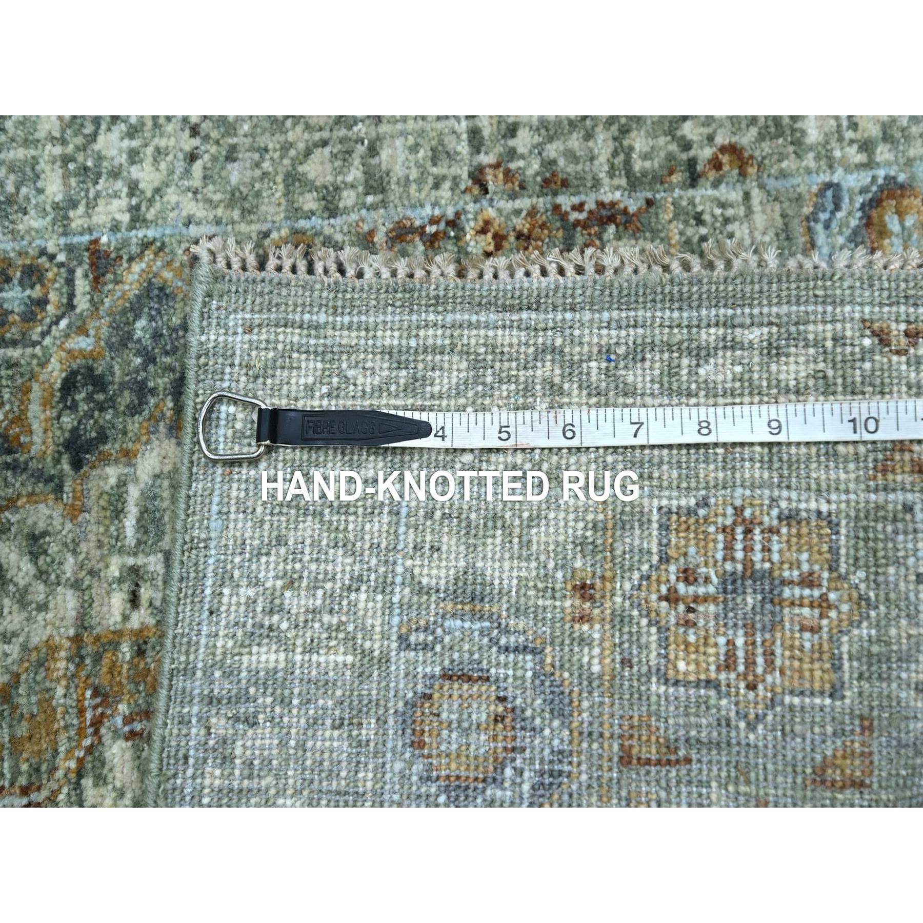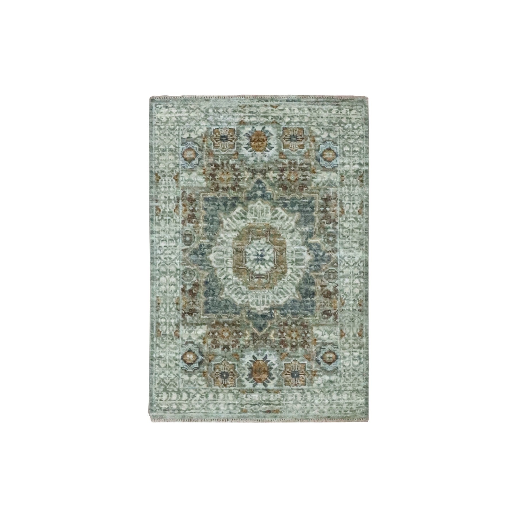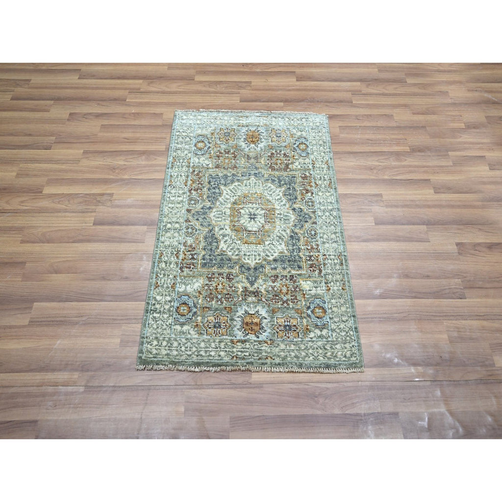 2'1"x3'2" Sage Green, Pre Historic 14th Century Influence, Mamluk Design, Natural Dyes, Hand Knotted, Pure Wool, Sample, Mat, Oriental Rug FWR460908