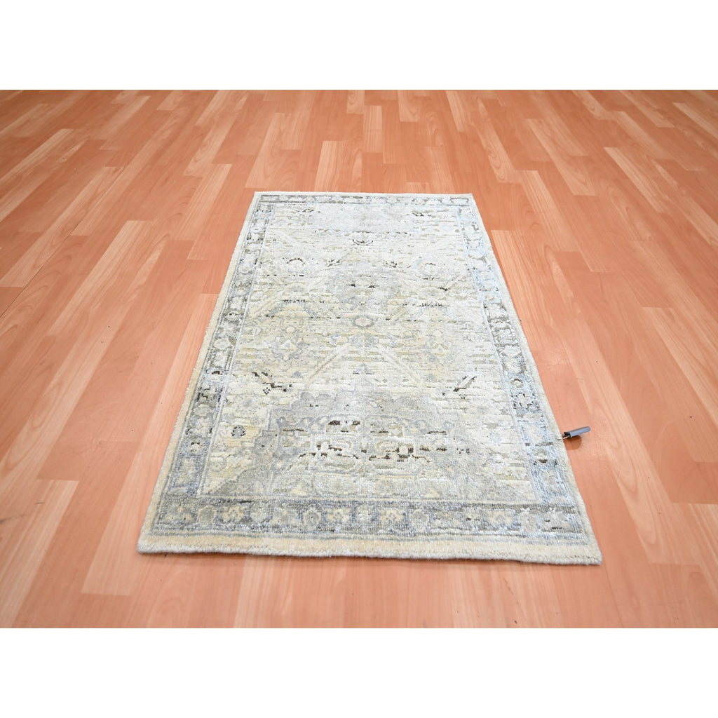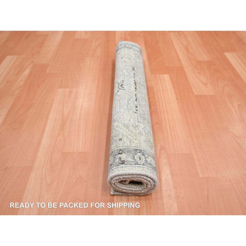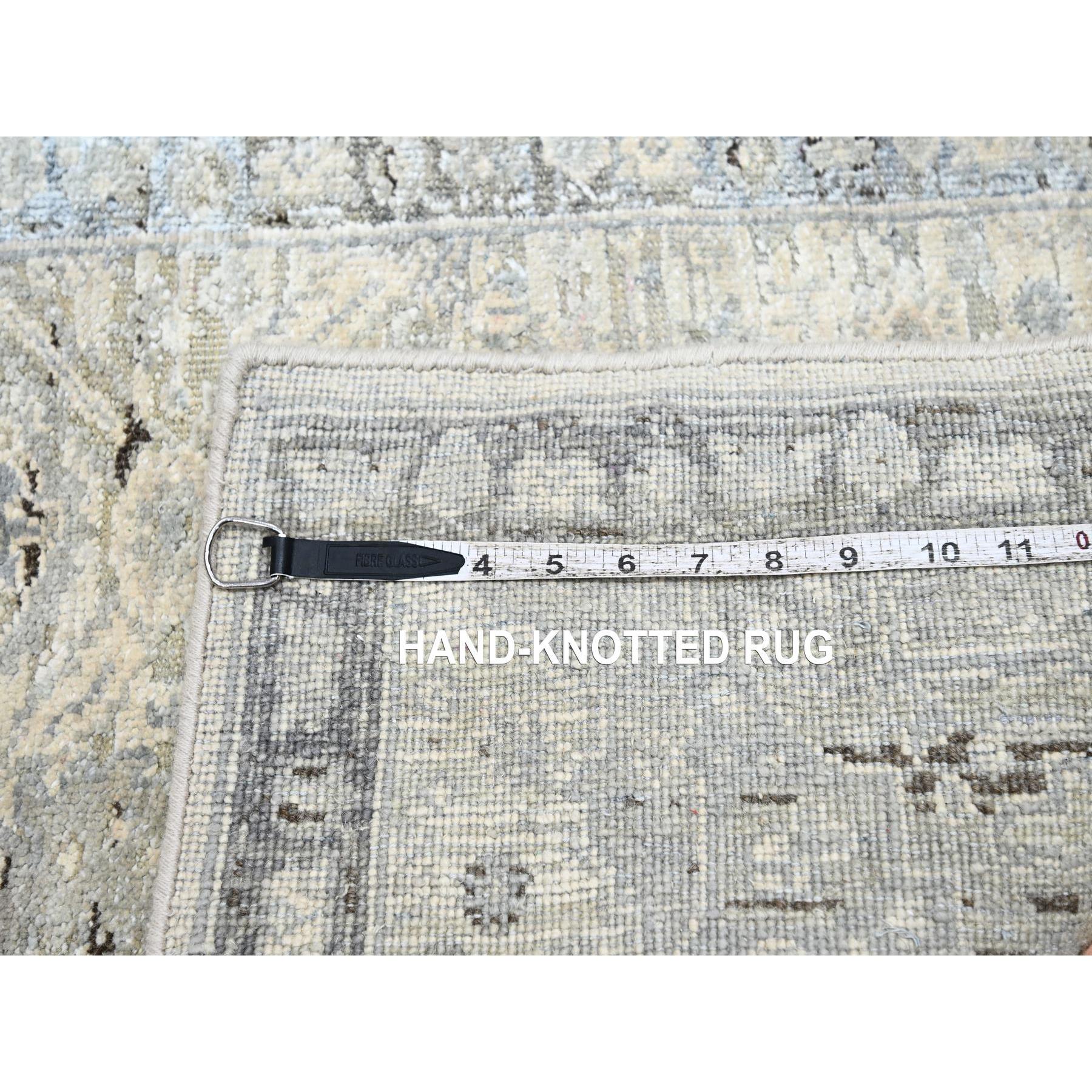 2'1"x3' Eggshell White, Hand Knotted, Pure Silk And Textured Wool, Oushak With Geometric Motif, Mat, Oriental Rug FWR452904