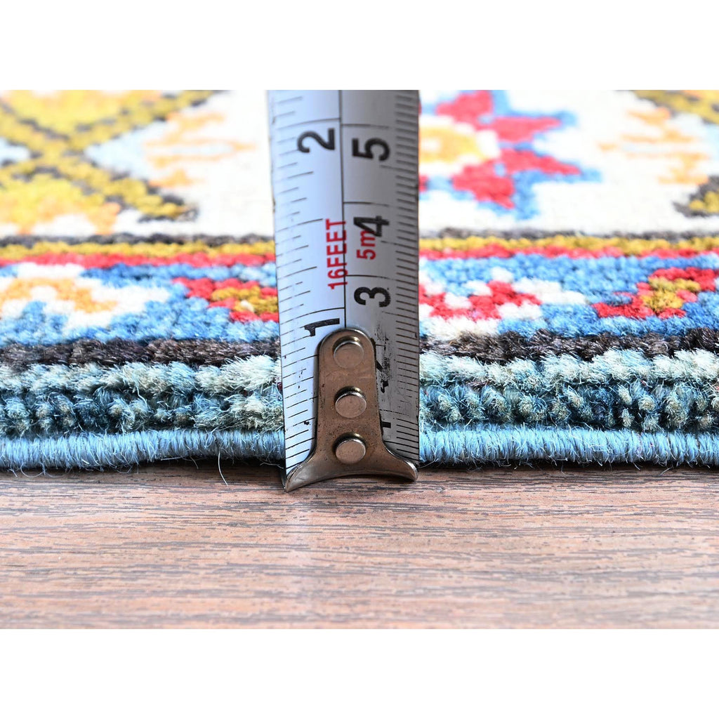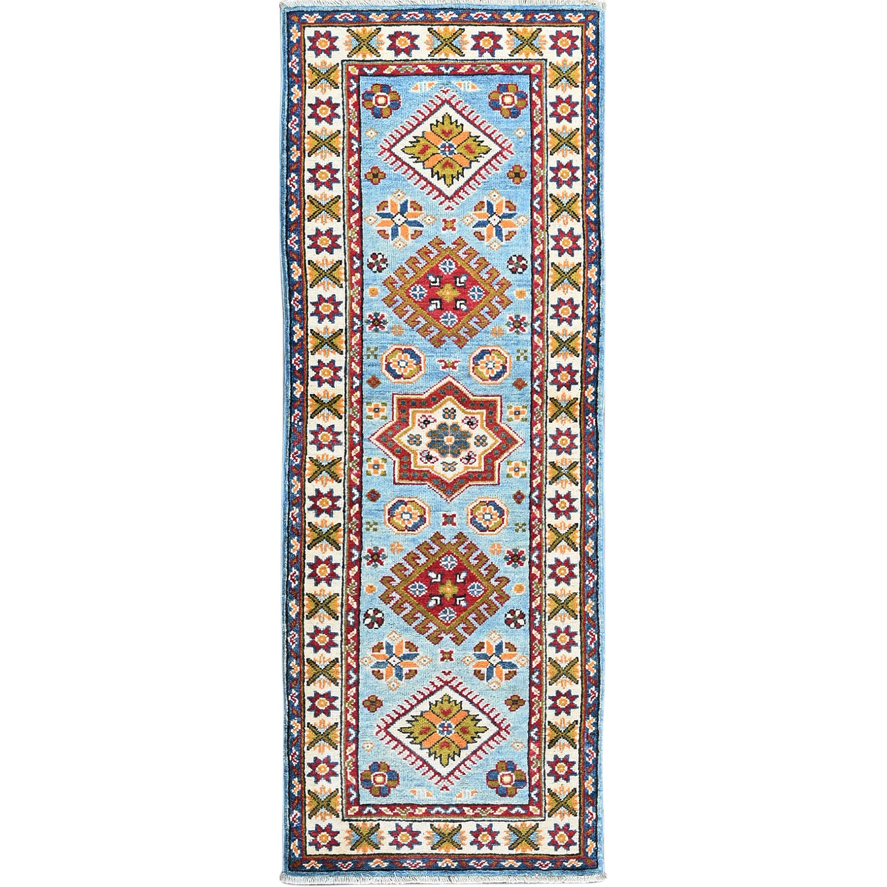 2'1"x5'9" Baby Blue, Kazak With Geometric Medallions Design, Hand Knotted, Soft And Velvety Wool, Denser Weave, Vegetable Dyes, Narrow Runner, Oriental Rug FWR2952