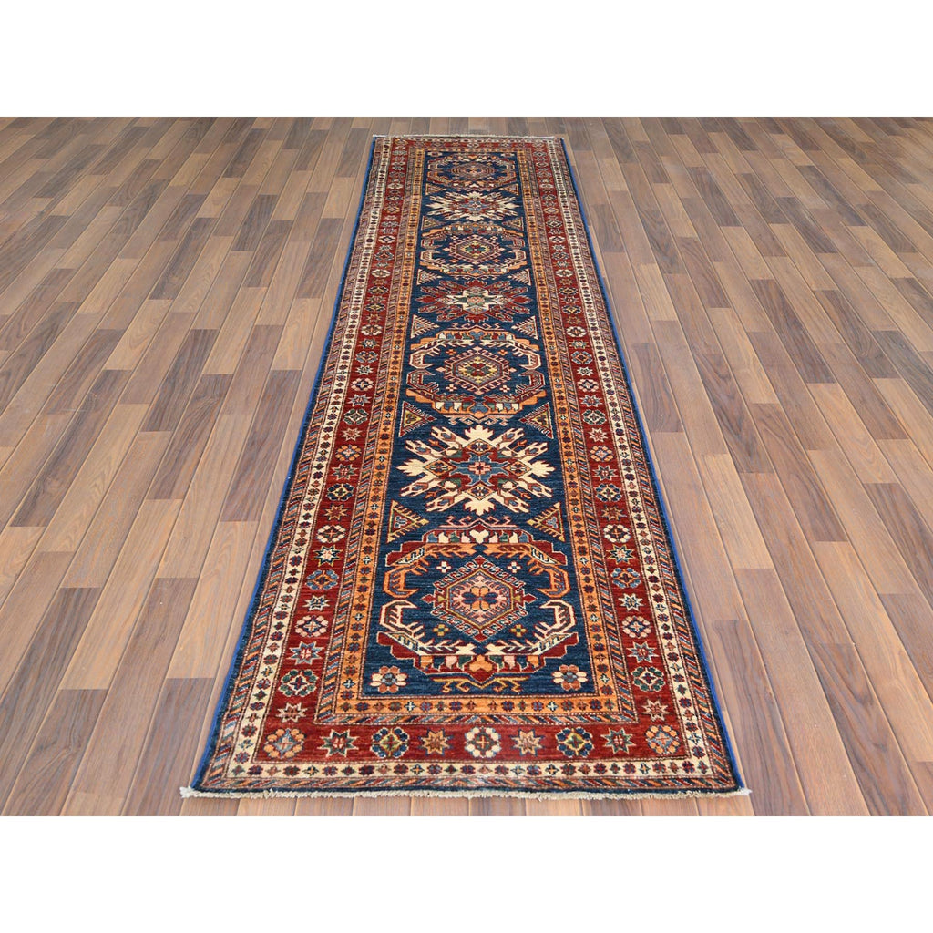 2'10"x11' Shiny Wool Hand Knotted Navy Blue Afghan Super Kazak With Tribal Medallions Design Oriental Runner Rug FWR368712