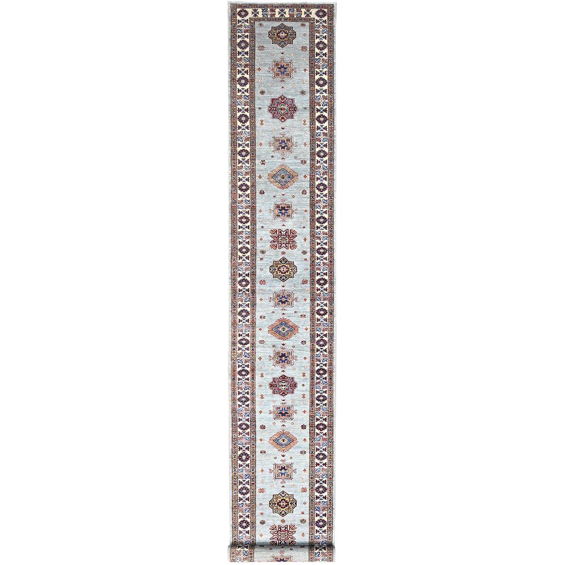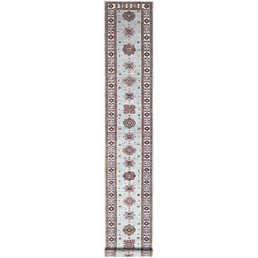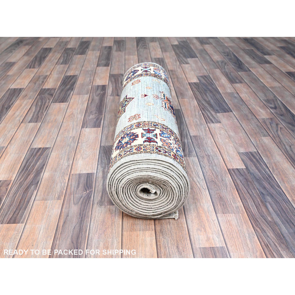 2'11"x22'7" Puritan Gray, Denser Weave, Oversized, Smooth And Shiny Wool, Colorful Tribal Elements All Over, Natural Dyes, Afghan Hand Knotted Super Kazak Oriental Runner Rug FWR756